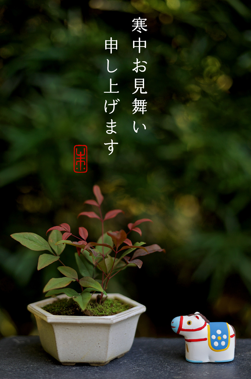 本年の干支、午(うま)の置物と南天の鉢植えを並べてのご挨拶になります。